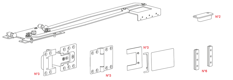 Complete set of fittings for 2 folding doors For cabinet body 1000mm (+- 2mm). Width of 1 wing 497mm (+- 1mm). Overlap 16 - 23 mm, depending on the thickness of the cabinet sides. Maximum weight of both wings - 35 kg. Door thickness 18 - 22 mm. Color white RAL9002, powder coating.