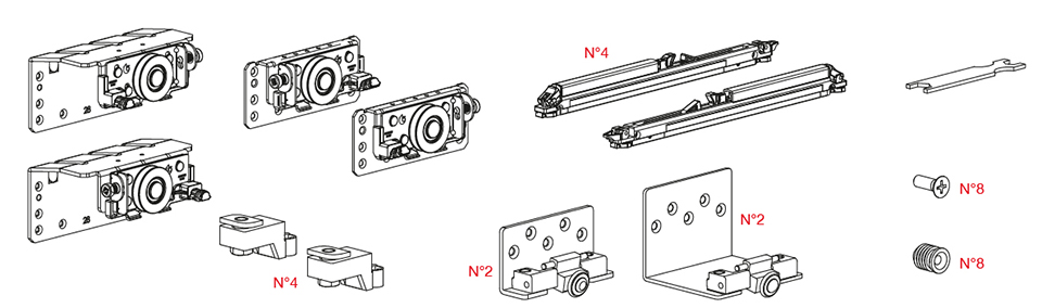 Vasalatszett 2 ajtószárnyra légcsillapítóval (4 db). Lemezvastagság max.25mm. Ajtószárny max. terhelhetőségea 40 - 80 kg. Min.ajtószárny szélesség- 600mm. Megjegyezzük, hogy az ilyen típusú vasalatoknál a szárny felfüggesztése a súlyponttól függ, és szárnyelhajlás fordulhat elő(általában a terhelt rendszerekre vonatkozik). Feszültségek feloldása 88040 - süllyesztett és DT157 - több mint 2,3m - megerősítettek nagyobb feszültségekhez (kat.2014 str. 5.8