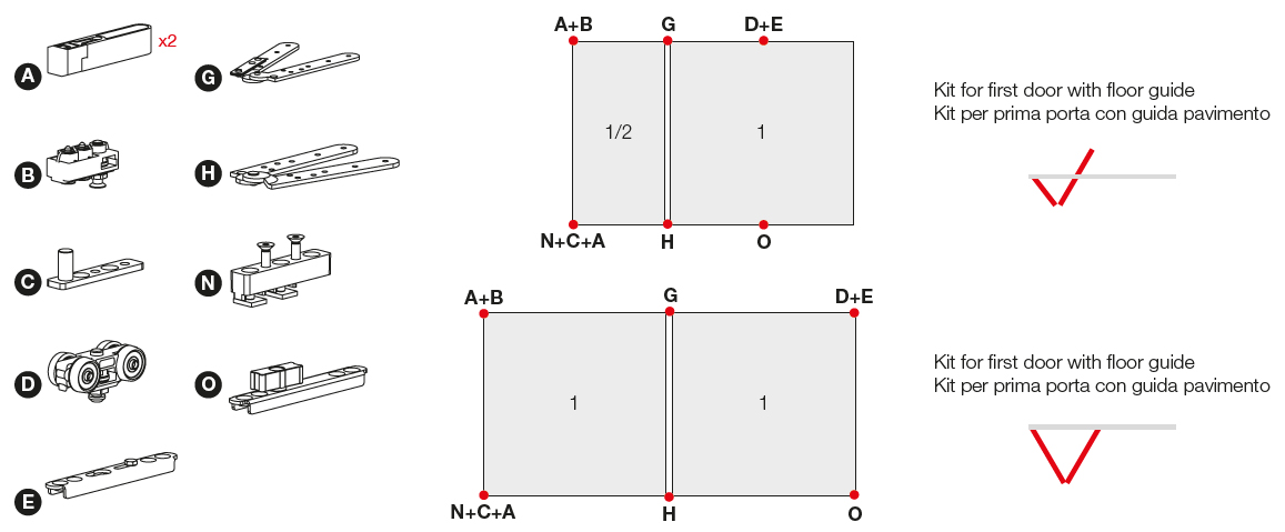 Sada kování pro dvě křídla se skládacími závěsy. Verze se spodním vedením, bez magnetické aretace. Pro výšku dveří max. 2400mm, nosnost 80kg/1 křídlo. Tloušťka materiálu 26 - 45mm. Barva černá (práškově lakovaná).