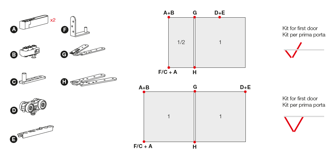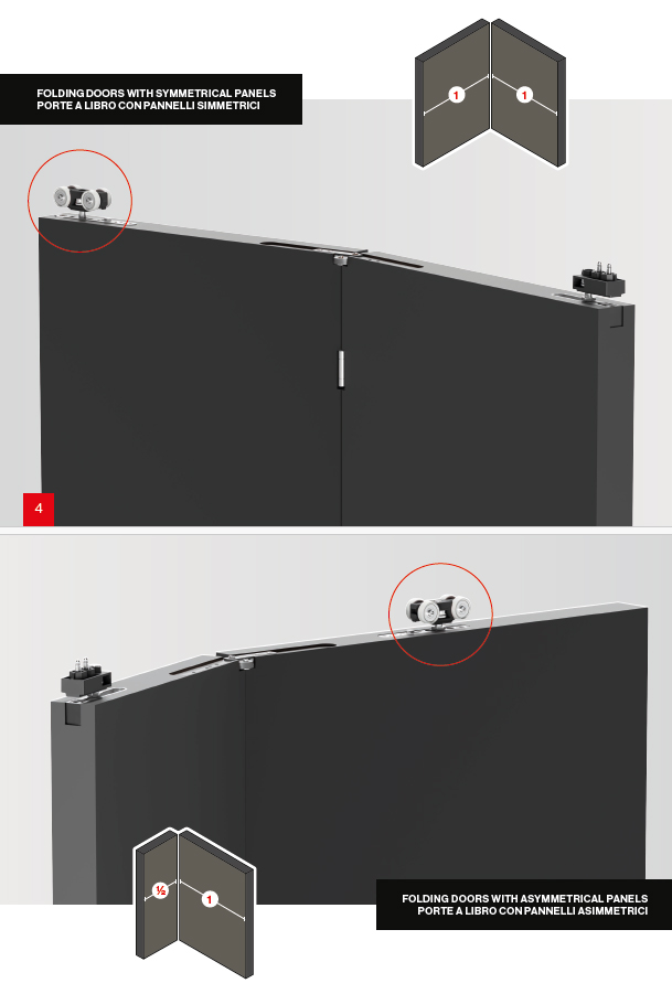 Sada kování pro dvě křídla se skládacími závěsy. Verze bez magnetické aretace a spodního vedení. Pro výšku dveří max. 2400mm, nosnost 80kg/1 křídlo. Tloušťka materiálu 26 - 45mm. Barva černá (práškově lakovaná).