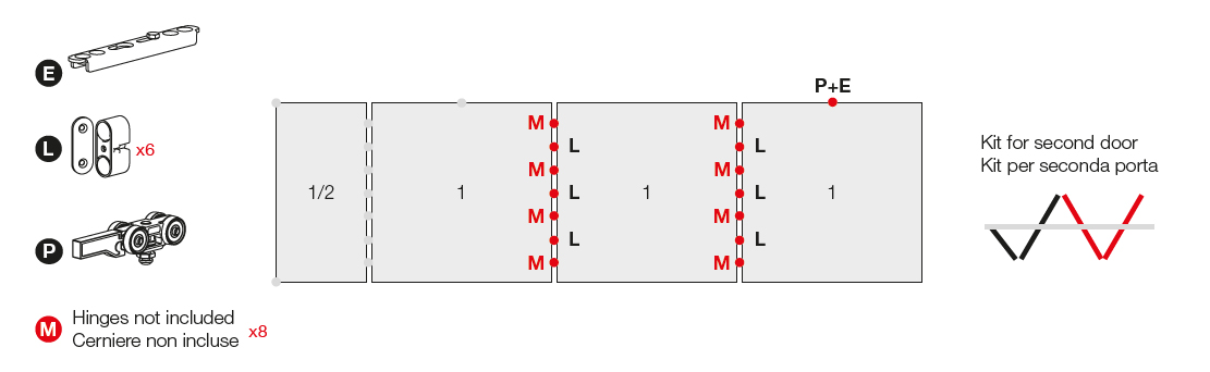 Fitting set for the first biplane. It contains two magnetic arresters, without folding and inter-door hinges. Version without lower guide. For door height max. 2400mm, load capacity 80kg/1 leaf. In the case of four doors - 40kg/1 wing, six doors - 25 - 30kg/1 wing. Material thickness 35 - 45mm. Color black (powder coated).