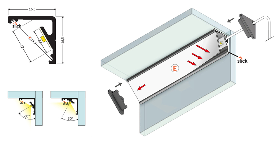 TM Sarok profil nagy szórásfelülettel. A 30 °/60 ° -os fényszórás lehetővé teszi a világítás szükség szerinti otthoni beállítását. Legfeljebb 12 mm szélesek a LED csíkok, jó a hőelvezetés. Felűl szerelhető a takaró profil. Méretek 4050 x 16,5 x 16,5 mm.Rögzítés ragasztással vagy csavarozással.