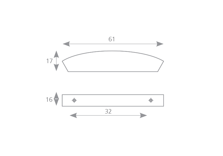 Fogantyú furattávolság: 32 mm, Teljes hossz.: 61 mm, szélesség: 16mm, Magasság 17 mm, felület: csiszolt nikkel, csavarokat is tartalmaz