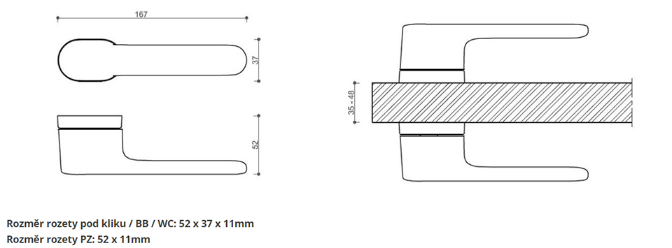 A fogantyú / BB / WC alatti rozetta mérete: 52 x 37 x 11mm Rózetta mérete PZ: 52 x 11mm