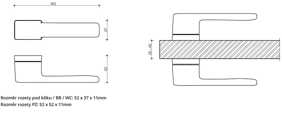 Rozměr rozety pod kliku / BB / WC: 52 x 37 x 11mm Rozměr rozety PZ: 52 x 52 x 11mm