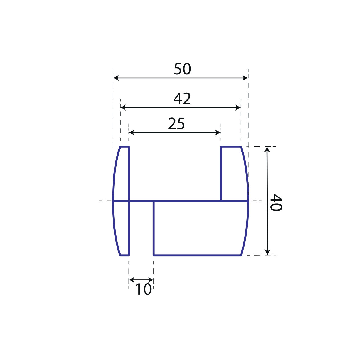 Teljes méretek 40 × 50 mm. Horonyszélesség 10/25 mm. A hornyok mélysége kb. 19,5 mm.