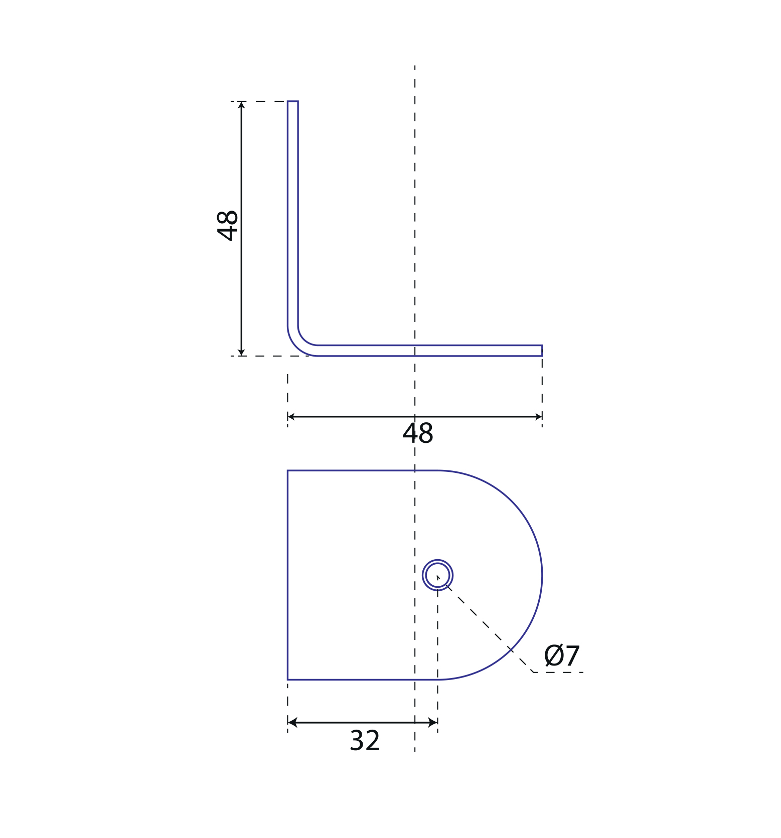 Oldalhossz 48mm, szögszélesség 40mm, anyagvastagság 3mm. A furatok átmérője 7mm, a furatok peremének ferdéje belülről 1.5mm x 45° (a süllyesztett csavarfej átmérője 10mm). A lyukak tengelyének távolsága a saroktól 32mm.